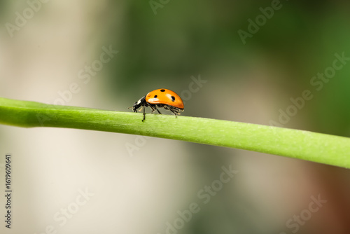 © Pixel-Shot, Fototapeta premium Green plant with cute small ladybug on blurred background outdoors, closeup