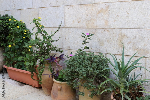 Naklejka premium Green plants and flowers grow in a flower pot.