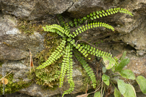 © Veronika, Naklejka premium Green plants between the stones. The moss on the stones. Old stone wall covered with green plants.
