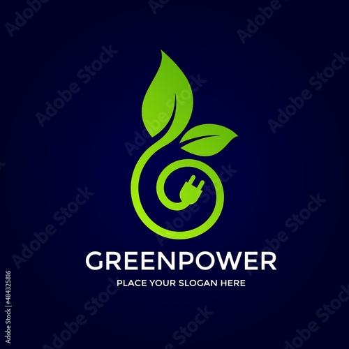 Fototapeta premium Green power vector logo template. This design use leaves and plug symbol. Suitable for technology.