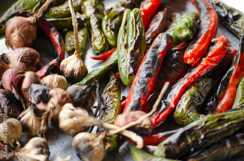 Fototapeta premium Green red chilies, onions, garlic and burn to prepare chili paste. Natural food ingredients.