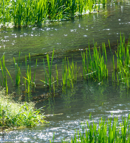 © schankz, Fototapeta premium Green reeds grow on the river in summer