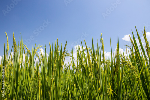 © yufagu, Obraz premium green rice and blue sky with cloud background