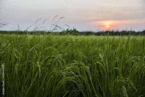 © Eak Ekkachai, Fototapeta premium Green rice field and sunset background