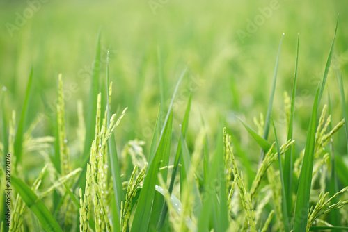 © methaphum, Obraz premium green rice field background close up beautiful yellow rice fields soft focus