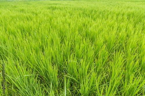 © kanonsky, Obraz premium Green rice field closeup ( background) in agriculture field.