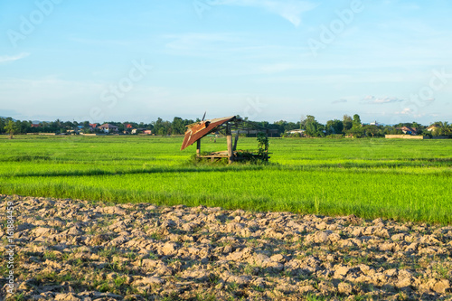Fototapeta premium Green rice field with mountains at time sunset.