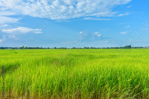 © NewSaetiew, Fototapeta premium Green rice field with mountains at time sunset.