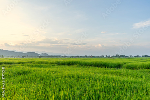 Fototapeta premium Green rice field with mountains at time sunset.