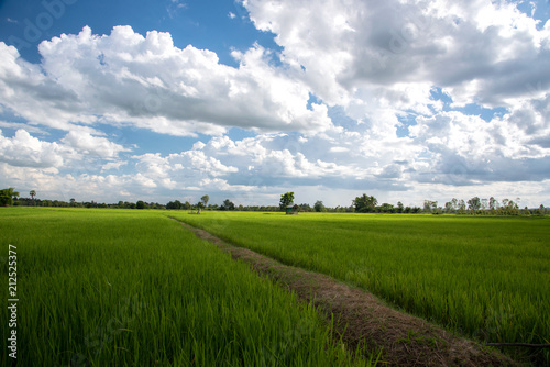 © sirisakboakaew, Obraz premium Green Rice Field with Mountains Background under Blue Sky, Chiang Mai, Thailand