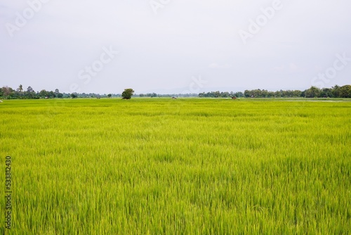 Fototapeta premium Green rice fields in the countryside in Thailand in the rainy season.