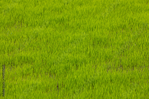 Obraz premium Green rice fields, still sprouts, a cereal cultivation in wet soil, East...