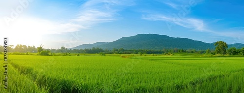 Fototapeta premium Green Rice Fields with Distant Mountains at Sunrise