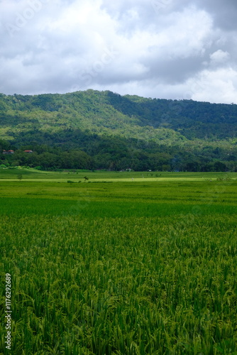© Ika, Fototapeta premium green rice fields with lush green mountains. rice fields in tropical areas.