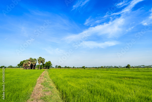 © sosconcan, Obraz premium Green rice paddy fields and blue sky