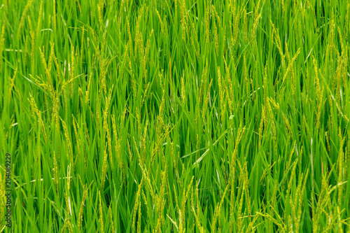 Obraz premium Green rice paddy fields, and is soon up to the seed harvest.