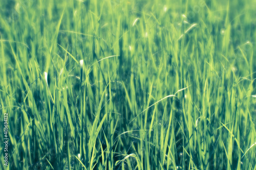 © Roman, Obraz premium Green rice sprouts close up in sunlight. The concept of organic textures. Background