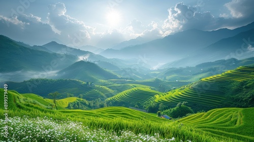 Fototapeta premium Green Rice Terraces in Mountainous Landscape