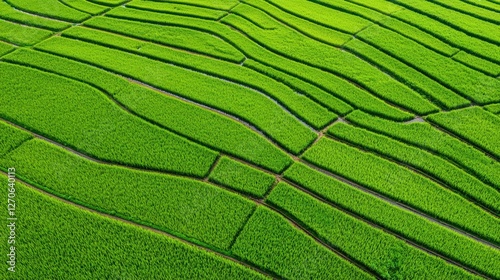 Fototapeta premium Green Rice Terraces in Smooth Patterns and Lines Under Bright Sunlight
