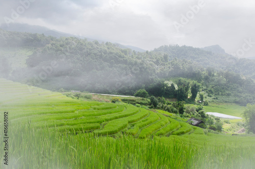 Obraz premium Green rice terraces on the hill in thick fog