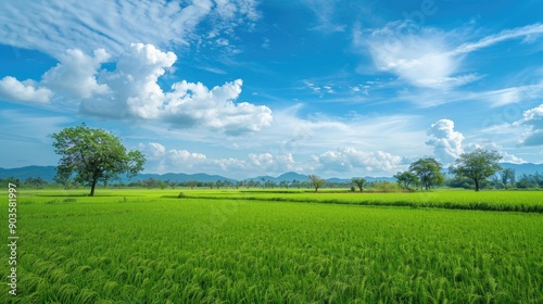 © AImmersive Imagery, Obraz premium Green rice trees in rice fields under a blue sky