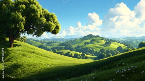 Fototapeta premium Green rolling hills and blue sky with clouds, natural landscape illustration