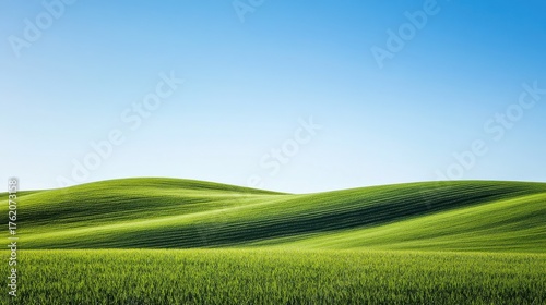 © Yana, Fototapeta premium Green rolling hills under a clear blue sky on a sunny day in an open countryside landscape