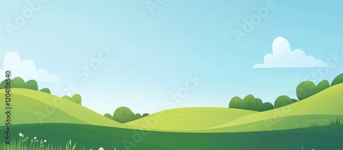 © pngking, Obraz premium Green rolling hills under a clear blue sky with fluffy white clouds and lush trees in the background Copy Space