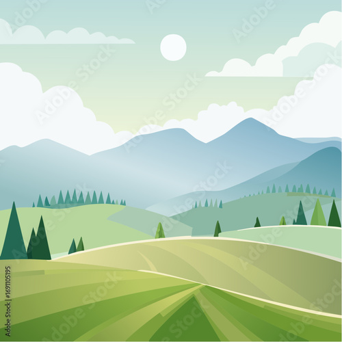 Fototapeta premium Green rolling hills under misty mountains
