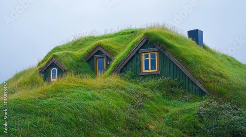 © Anak, Fototapeta premium Green roof house nestled in grassy landscape