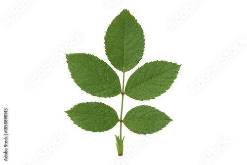 Fototapeta premium Green rose leaf with serrated edge on transparent background