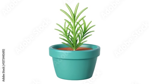 © ThreeDeeViews, Obraz premium Green rosemary plant in a turquoise pot with soil.