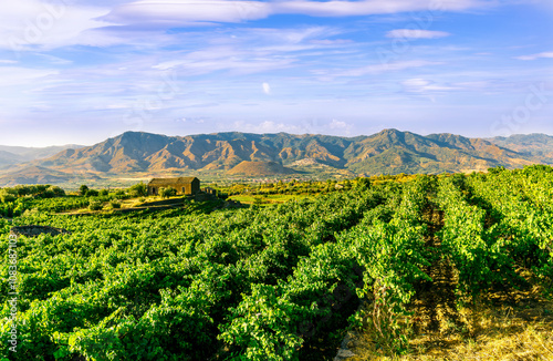 © Yaroslav, Fototapeta premium green rows of wineyard with grape on a winery during sunset with amazing mountains and clouds on background