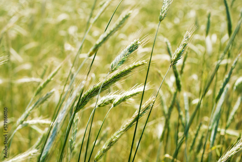 Obraz premium Green rye field ripens on a sunny summer day, soft focus. Agriculture