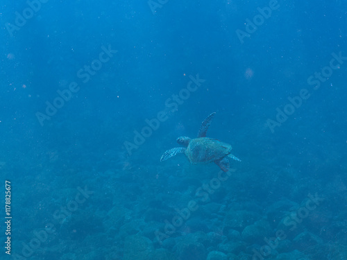 Obraz premium ゆったり泳ぐ美しく大きなアオウミガメ(ウミガメ科)。 英名学名:green sea turtle (Chelonia mydas) 静岡県伊豆半島賀茂郡南伊豆町中木ヒリゾ浜2024年