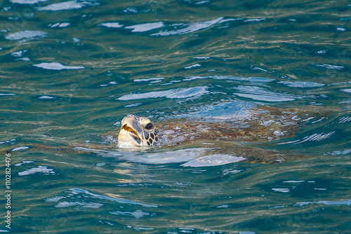 Fototapeta premium 中木港内で 息継ぎをするためにゆったり泳ぐ美しく大きなアオウミガメ(ウミガメ科)。 英名学名:green sea turtle (Chelonia mydas, family Turtles) 静岡県伊豆半島賀茂郡南伊豆町中木ヒリゾ浜2024年