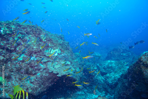 © d3_plus, Naklejka premium ゆったり泳ぐ美しく大きなアオウミガメ(ウミガメ科)とタカベ(タカベ科)の群れ。 東京都伊豆諸島式根島-2020年10月 Green sea turtle (Chelonia mydas, family Turtles) Yellowstriped Butterfish (Labracoglossa argentiventris).