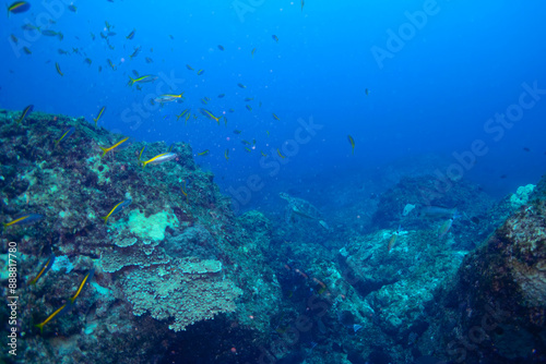 © d3_plus, Fototapeta premium ゆったり泳ぐ美しく大きなアオウミガメ(ウミガメ科)とタカベ(タカベ科)の群れ。 東京都伊豆諸島式根島-2020年10月 Green sea turtle (Chelonia mydas, family Turtles) Yellowstriped Butterfish (Labracoglossa argentiventris).