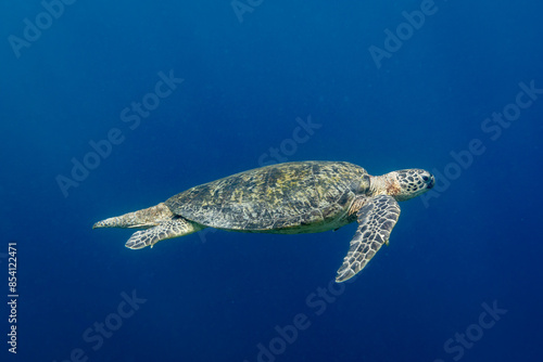 Fototapeta premium Green Sea Turtle, Chelonia mydas, swimming in blue tropical waters