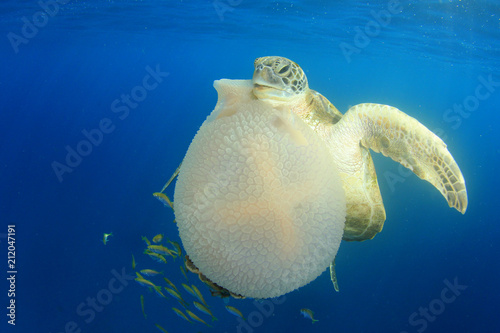 Fototapeta premium Green Sea Turtle eats giant Mosaic Jellyfish