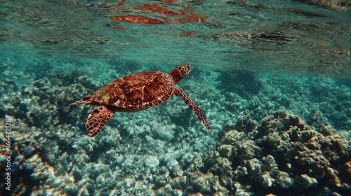 Obraz premium Green sea turtle gliding through clear ocean waters, surrounded by dappled...