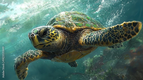 Fototapeta premium Green sea turtle gliding through the ocean depths.