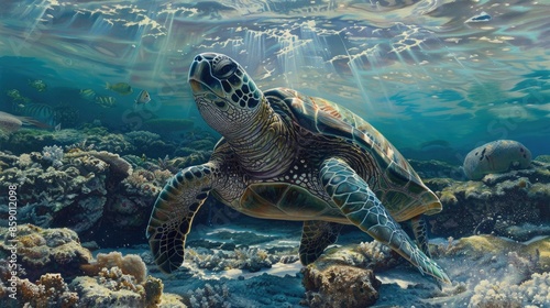 Fototapeta premium Green sea turtle near a shallow reef