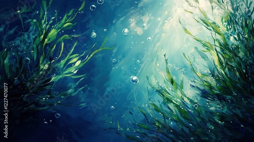 Fototapeta premium Green seaweed and seagrass stretching towards the light, scattered bubbles enhancing the serenity of the deep blue aquatic background
