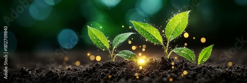 © Ilja, Fototapeta premium Green Seedling Emerging from Fertile Soil, Glowing in Sunlight with Dew Drops, Springtime Growth