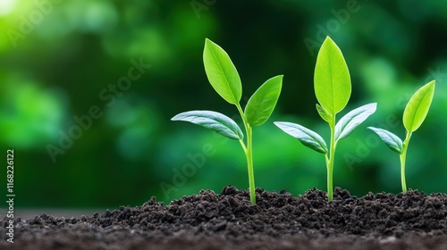 Naklejka premium Green seedlings emerging from rich soil, symbolizing growth.