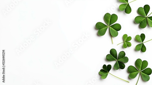 © Grapy Media, Obraz premium Green Shamrocks on a White Surface Symbolizing Luck and Irish Heritage Celebrations for Saint Patrick
