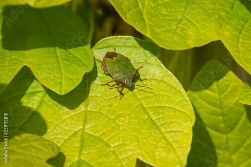 Fototapeta premium Green Shield Bug on Leaf in Springtime