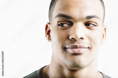 Fototapeta premium Green-shirted man, playful, curious sideways glance