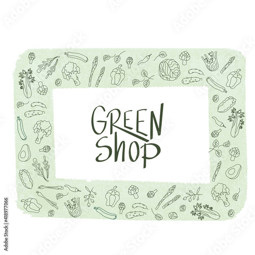 Fototapeta premium Green shop sign with green outline vegetables frame. Handwritten lettering...